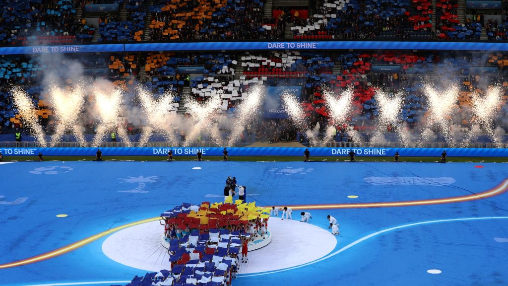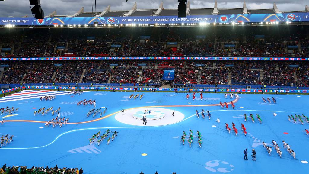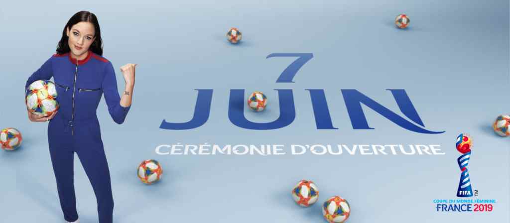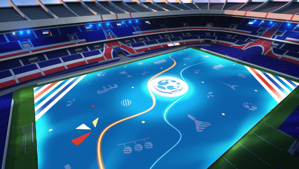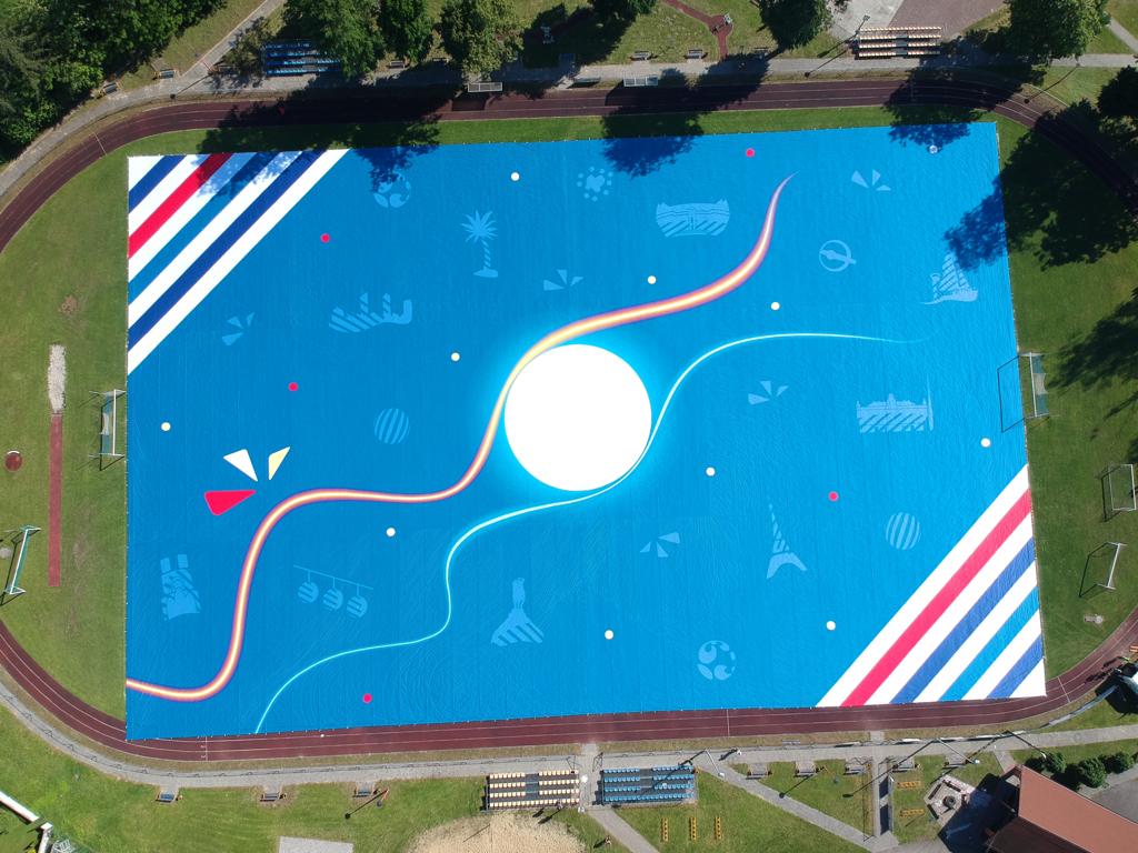 Design de la bâche géante de la cérémonie d’ouverture, au parc des Princes, sur laquelle Jain et ses danseurs ont briller ! Habillage des noms des 9 villes hôtes. (visible sur la vidéo à partir de 1:25)