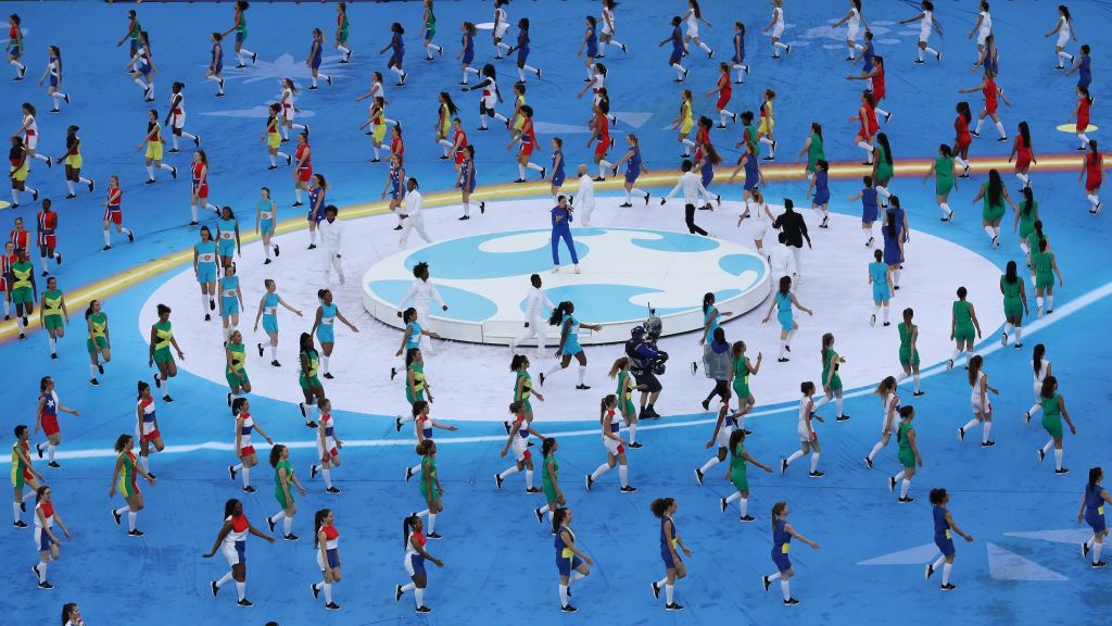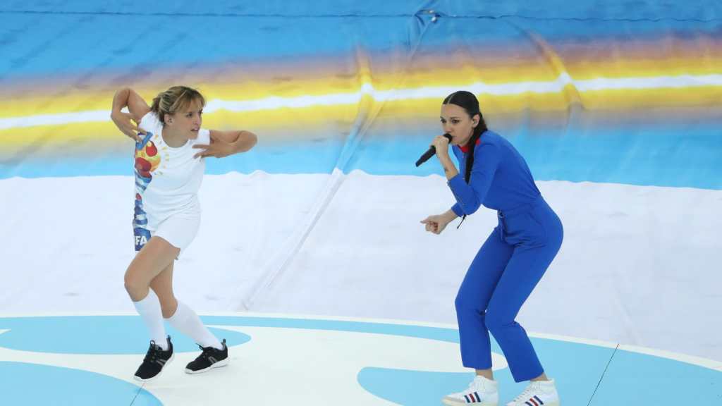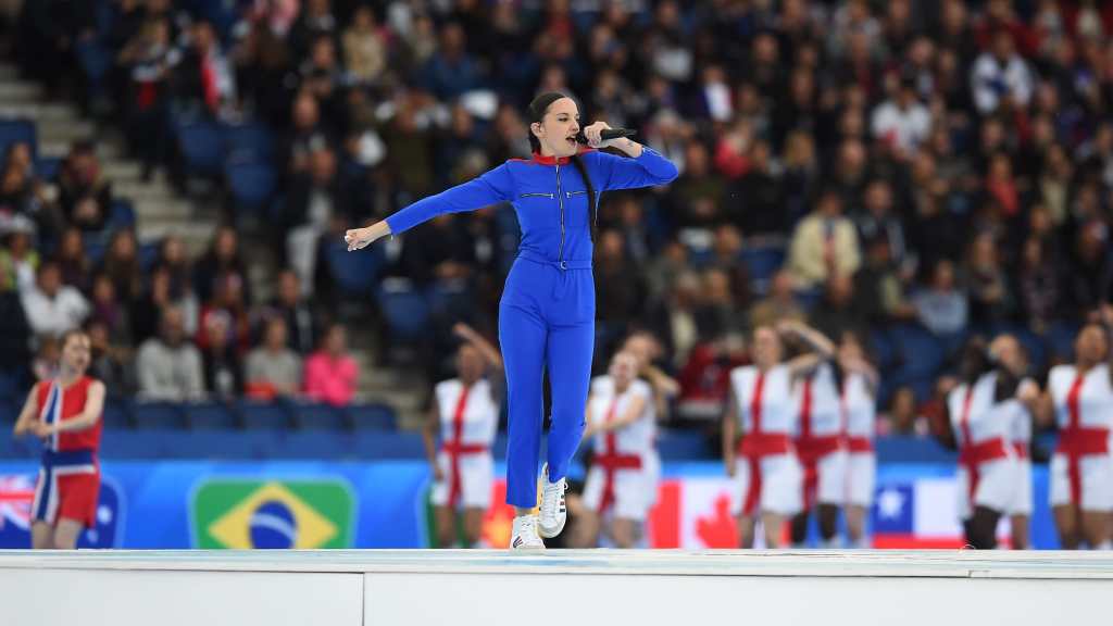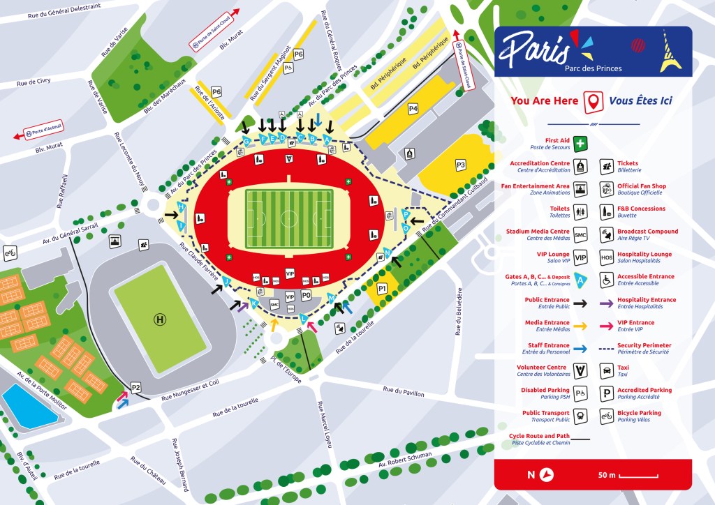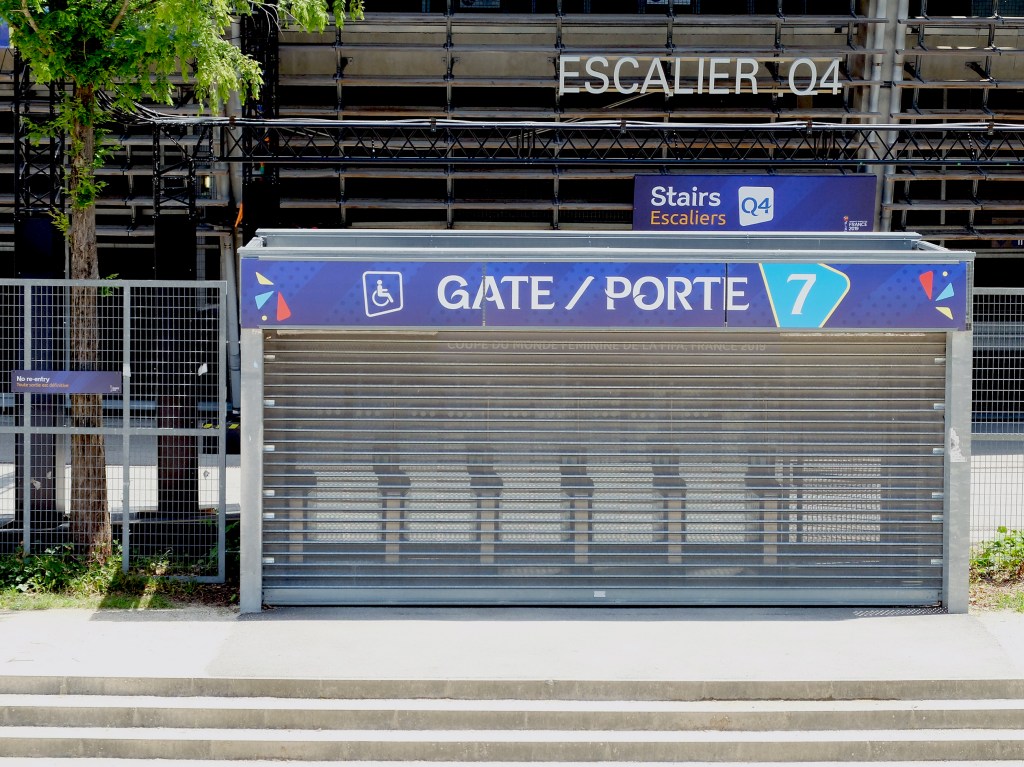 Design de la bâche géante de la cérémonie d’ouverture, au parc des Princes, sur laquelle Jain et ses danseurs ont briller ! Habillage des noms des 9 villes hôtes. (visible sur la vidéo à partir de 1:25)